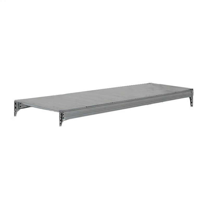 - Rayonnage entièrement galvanisé: les tablettes très robustes en galva sont enfonçées dans les lisses. Les tablettes sont très faciles é mettre en place ou à être enlevées: par exemple pour l'entreposage de marchandises débordant temporairement 1 niveau de lisses.